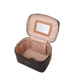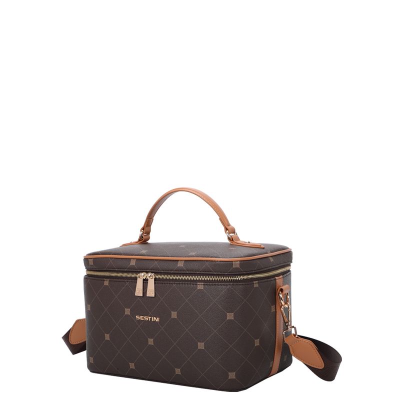 Mulheres encantadoras e confiantes precisam de um look que as acompanhem na jornada do dia a dia. Pensando nisso, a Sestini desenvolveu a Frasqueira Monograma, que possui uma estampa elegante produzida em PVC, com cores sóbrias e detalhes em dourado, onde você pode guardar seus pertences pessoais, como maquiagem e objetos delicados. Ela também possui uma alça removível, para te deixar com as mãos livres para manusear, e a alça carona, que encaixa no carrinho da sua mala, facilitando o transporte. Por dentro, a frasqueira é repleta de funcionalidades, tendo espelho e divisórias de diferentes tamanhos para guardar itens de forma organizada.
