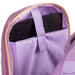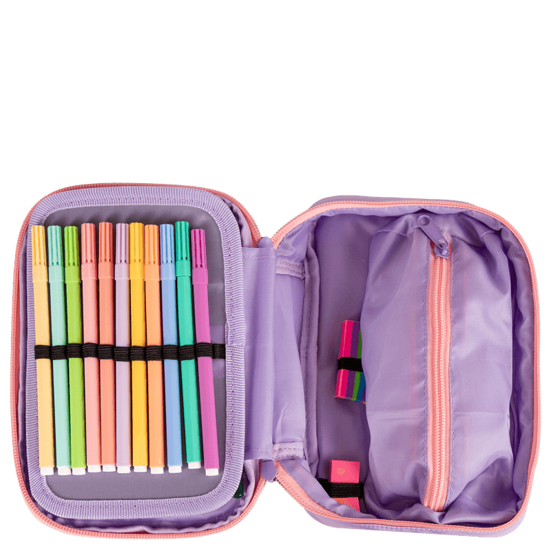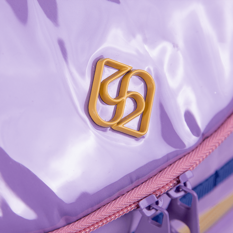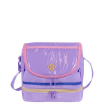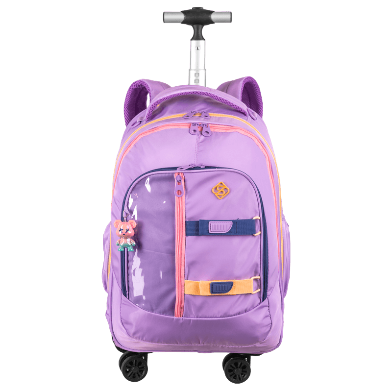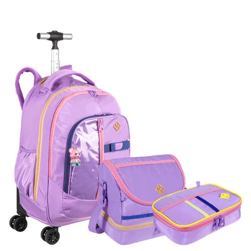 O Kit Mochila Carrinho com quatro rodas duplas, lancheira de dois compartimentos e estojo box da coleção Sestini Studio na cor lilás é a escolha perfeita para quem busca praticidade e estilo.
