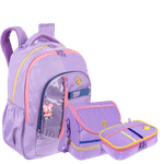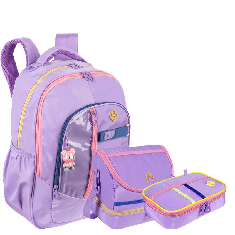 O Kit Mochila Grande com dois compartimentos, Lancheira com dois compartimentos e Estojo Box da coleção Sestini Studio na cor lilás é a escolha perfeita para quem busca estilo e funcionalidade. Este conjunto é confeccionado em poliéster, um material resistente e durável, ideal para o uso diário.