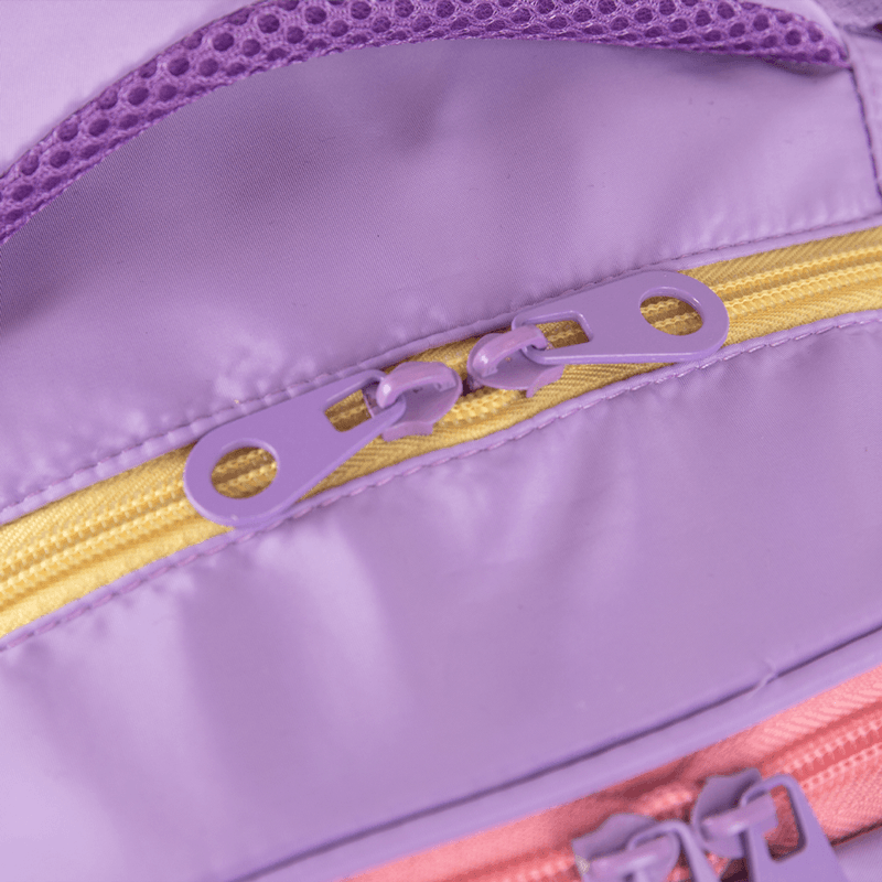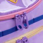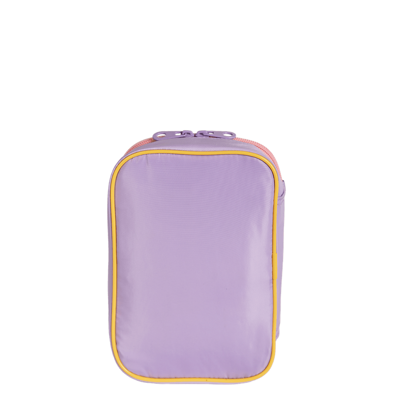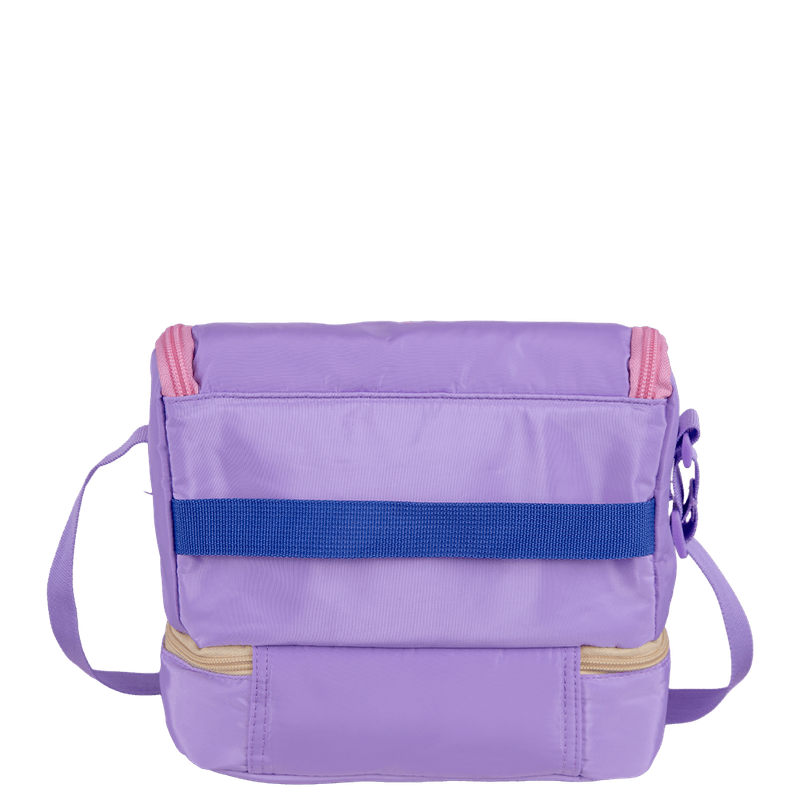 O kit inclui uma lancheira com dois compartimentos, ideal para levar lanches e bebidas, e um estojo box que mantém os materiais escolares organizados. O design é complementado por um pingente e pontos que permitem a fácil fixação de outros acessórios. Para maior praticidade, há um bolso específico para guardar as alças, mantendo tudo em ordem.