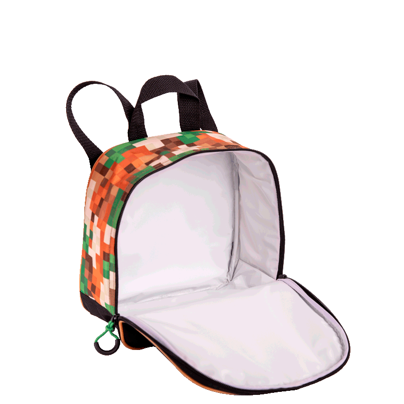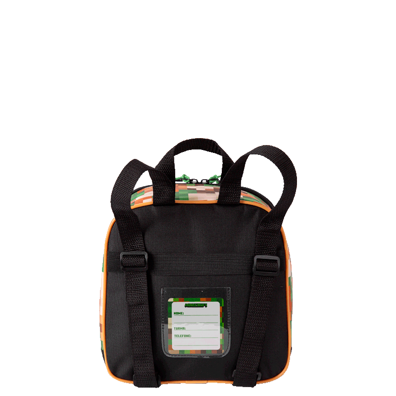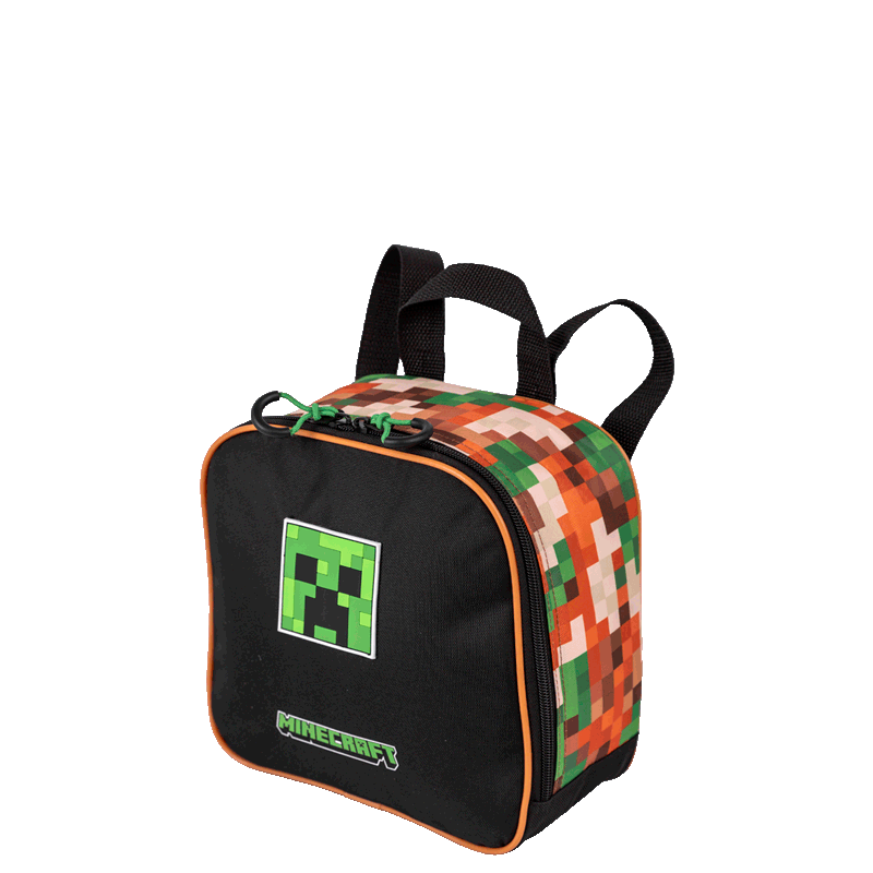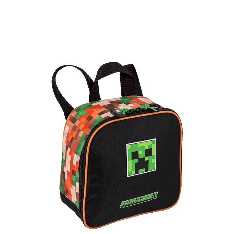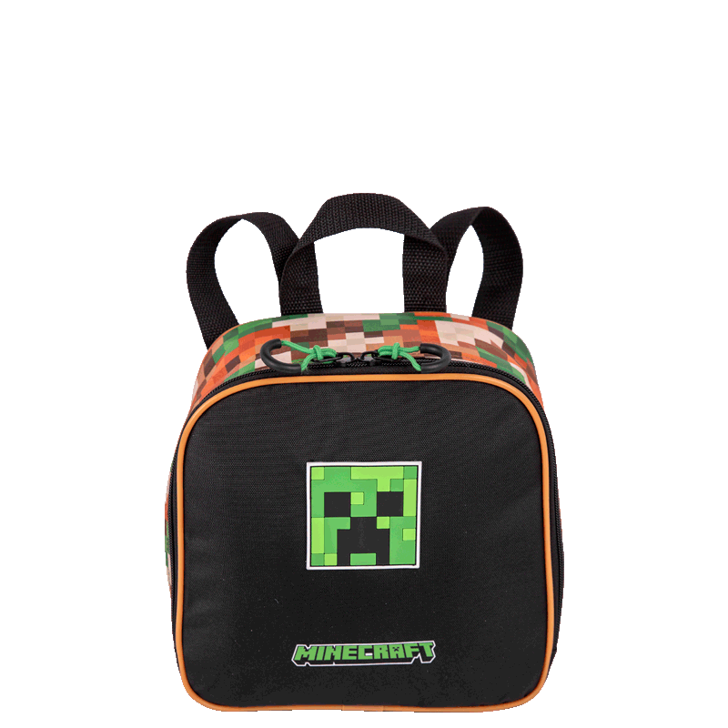 O painel frontal em poliéster é decorado com elementos icônicos do universo Minecraft, tornando a lancheira ainda mais atraente. Para facilitar o acesso aos itens, há um bolso de acesso rápido, perfeito para guardar pequenos objetos.