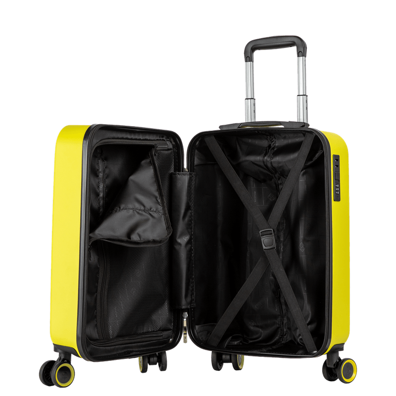 A mala conta com um cadeado fixo flat que assegura a segurança dos seus itens, enquanto a abertura central ampla oferece um acesso fácil ao espaço interno. Dentro, você encontrará uma divisória com zíper e um elástico que ajuda a manter suas roupas organizadas e no lugar durante a viagem.