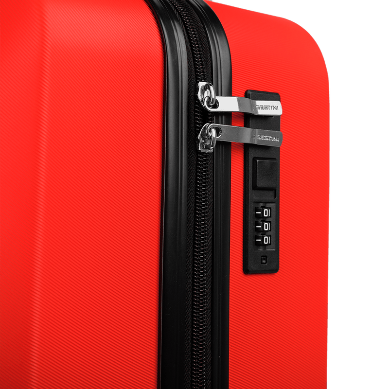 Fabricada em material ABS, a mala é leve e resistente, perfeita para suportar as exigências das viagens. O sistema de fechamento conta com um cadeado fixo flat, que proporciona segurança adicional, enquanto a abertura central ampla facilita o acesso ao interior.