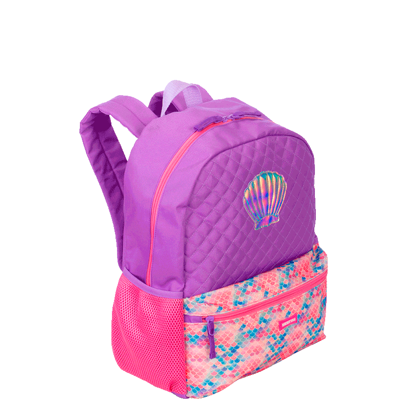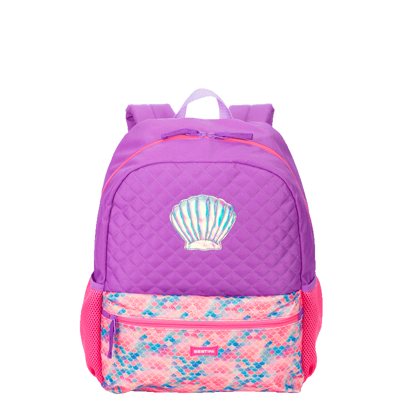 Inspirada nos elementos do fundo do mar e com a cor tendência da estação, a nova linha Sereia tem um bolso frontal colorido, com textura de glitter que lembram escamas, além de uma concha holográfica. Os puxadores do zíper tem reforço em cadarço e no compartimento principal cabe a pasta de atividades e os materiais escolares. A versão com alça de costas tem reforço espumado e ajuste de altura para o ombro.