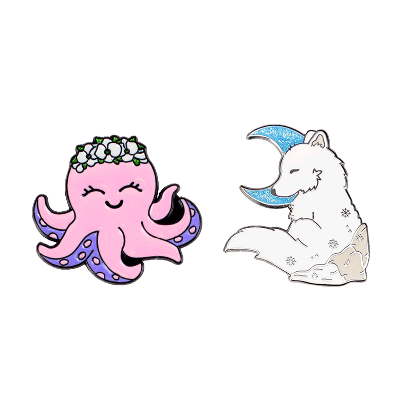 "Os pins de metal com design de polvo e raposa são itens encantadores que fazem parte da coleção Sestini Studio Acessórios. Com um material resistente e de alta qualidade, esses acessórios são ideais para quem busca personalizar mochilas, lancheiras e estojos, trazendo um toque único e divertido a cada peça.